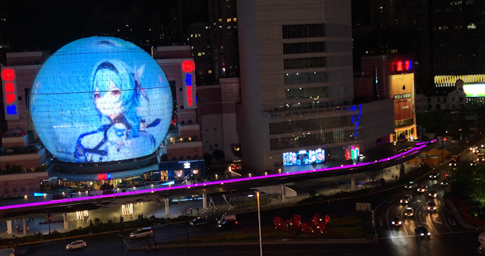 上週末,美羅城的玻璃球體上展出了多位《原神》中的遊戲人物,這也是米哈遊在徐彙區舉行的“幻想徐匯,青春奇遇”聯名活動的一部分。