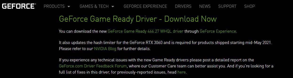 4月29日發佈的GeForce 466.27驅動更新説明顯示,英偉達在原先的“軟件限制”之後,新增了“硬件限制”。公告顯示,5月中旬開始發貨的產品都會安裝“哈希限制器”(hash limiter )。