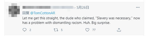 對於科頓的言論,其實很多美國網民已經見怪不怪了。曾率先散佈“新冠病毒人為泄露”陰謀論、叫囂就疫情向中國索賠的他,一直衝在反華一線,奇葩言論數不勝數。早在去年7月,科頓就曾援引所謂的“美國國父引言”,稱“奴隸制是美國聯邦建立的必要之惡”,直接被罵上了推特的趨勢榜。他還曾因在《紐約時報》發文力挺“出兵鎮壓反種族歧視抗議者”而導致編輯辭職。