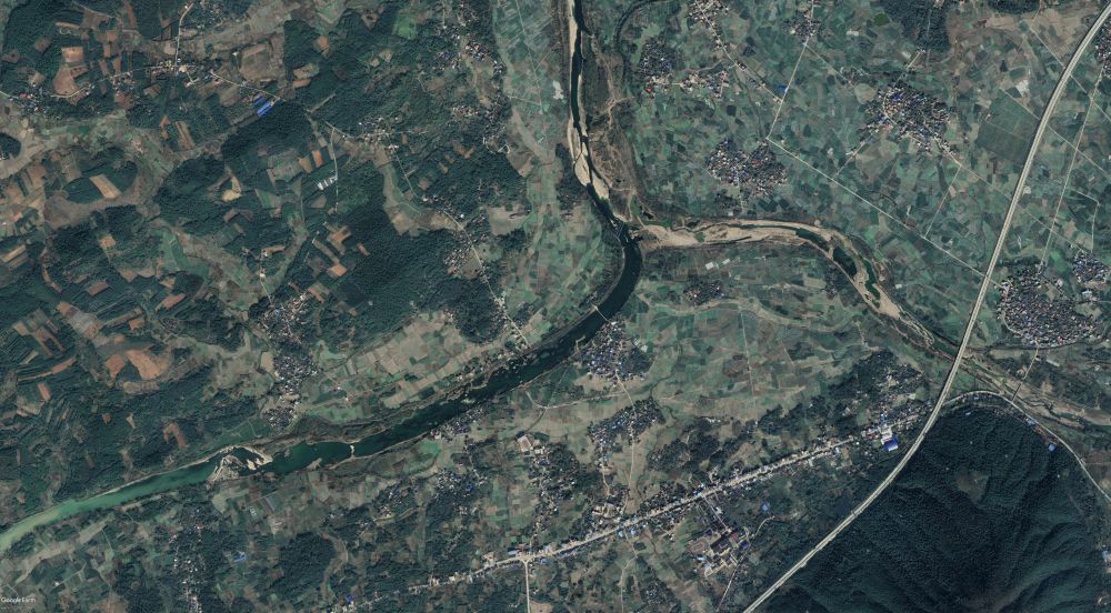 鳳凰嘴渡口衞星圖,距離位於全州的紅軍長征湘江戰役紀念園約17公里,形如鳳凰之喙,是犧牲紅軍最多的渡口。