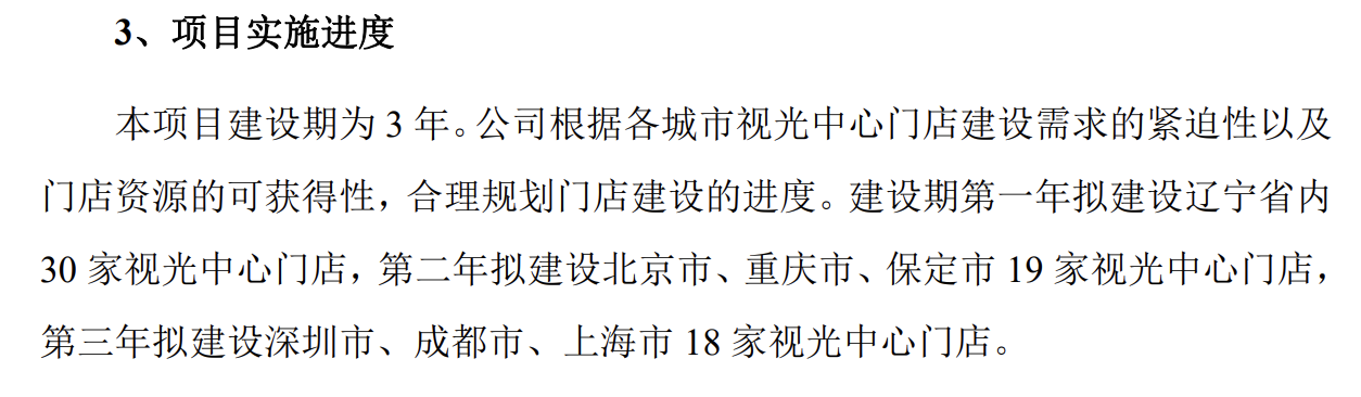 與此同時,何氏眼科新設視光中心項目也將首先在遼寧省內建設30家視光中心,並在第二年建設位於北京、重慶、保定的19家視光中心,第三年在深圳、成都、上海建設18家視光中心,累計投資23450萬元。