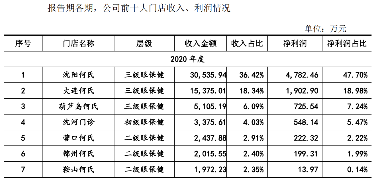 同時,何氏眼科在招股書中披露,上述門店報告期內淨利潤佔比較高,系莊河何氏、遼陽何氏、鐵西何氏、丹東何氏、上海何氏等新設門店開業以及阜新何氏、朝陽何氏、本溪何氏等門店尚未到盈虧平衡點,虧損額較大所致。