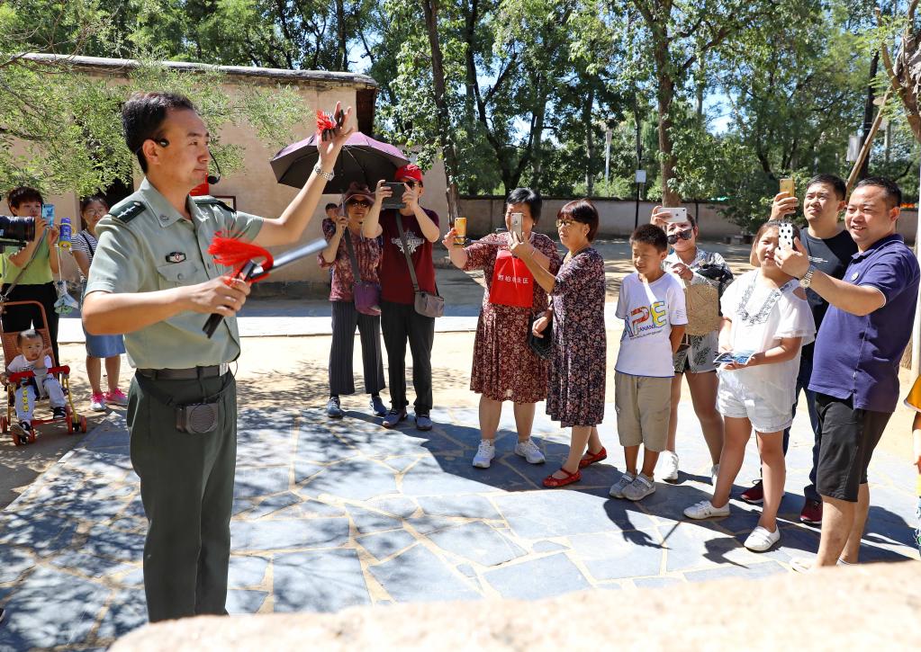 在西柏坡舊址,講解員韓向飛為遊客進行講解(2019年8月30日攝)。新華社記者楊世堯攝
