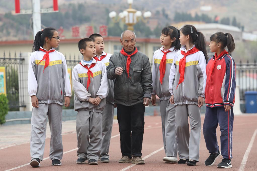 閆青海(中)給孩子們講奮鬥創業的故事(2019年4月8日攝)。新華社發