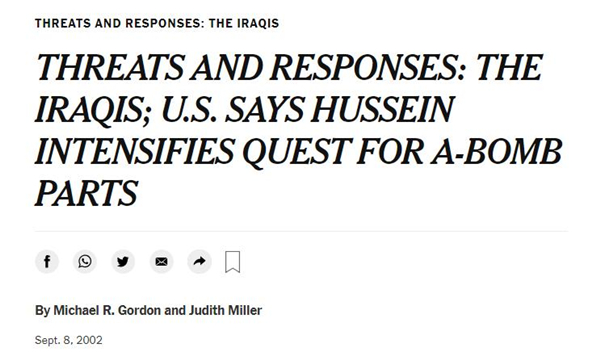 2002年9月8日,Michael R. Gordon和Judith Miller在《紐約時報》發了一篇文章:Threats and Responses:The Iraqis; U.S. Says Hussein Intensifies Quest for A-Bomb Parts(威脅和反應:美國情報機構説薩達姆·侯賽因追逐獲取原子彈部件),這就是伊拉克大規模殺傷性武器問題的由來,也是2003年美國入侵伊拉克最重要的合法性理由的由來。這篇文章的主要消息來源是什麼?匿名的美國情報官員。Michael R. Gordon從來沒有交代過自己的信息來源是什麼,Judith Miller後來説了,她的消息來源是一箇中央情報局的暗探,後來為了這個事情還造了牢獄之災。