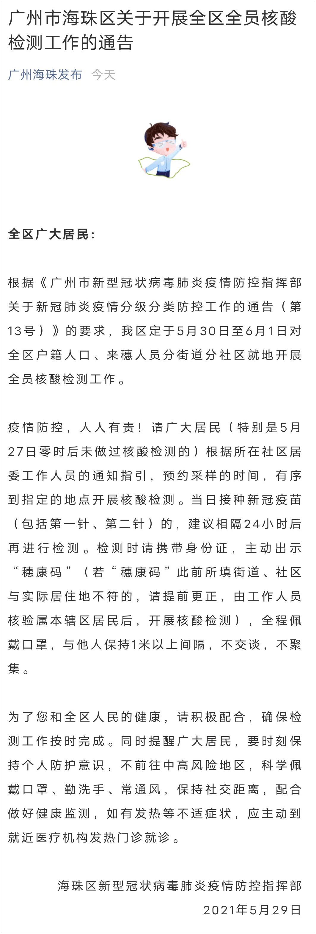 海珠區定於5月30日至6月1日對全區户籍人口、來穗人員分街道分社區就地開展全員核酸檢測工作。