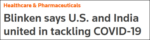 在當天的會晤中布林肯宣稱,由於印度曾經支援過美國抗疫,因此美國也打算向印度提供幫助:“在新冠疫情早期,印度曾經幫助過美國,這是我們永遠不會忘記的。現在我們希望確保自己也能幫助印度……我們團結一致,共同應對新冠疫情。”