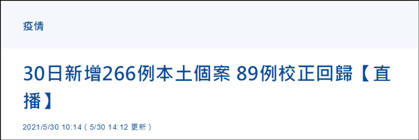 (觀察者網訊)據台媒“中央社”報道,台灣地區“中央流行疫情指揮中心”30日宣佈,台灣地區今日新增266例本土確診病例、無境外輸入病例,另有89例“校正迴歸”病例,總計355例。另新增11例死亡病例。