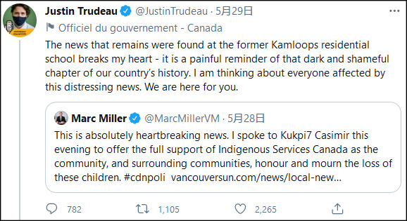 “在前坎盧普斯寄宿學校發現遺體的消息讓我心碎,這是我們國家歷史上黑暗而可恥的一章。我很關心所有被這個不幸的消息影響到的人,我們會在這裏支持你。”特魯多寫道。