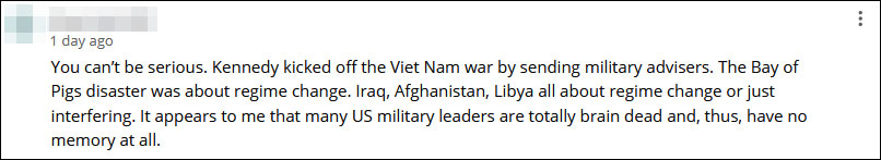 “別當真,肯尼迪當年派遣軍事顧問,從而引發了越戰。‘豬灣事件’是關於政權更迭的。伊拉克、阿富汗和利比亞都是關於政權更迭或干涉。在我看來,許多美國軍事領導人都已完全腦死亡,因此完全失憶了。”