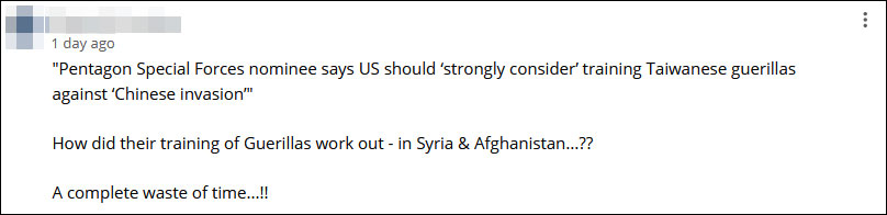 “‘強烈考慮’訓練台灣游擊隊抵抗‘中國(大陸)入侵’……他們在敍利亞和阿富汗的游擊隊訓練效果如何?完全在浪費時間!”