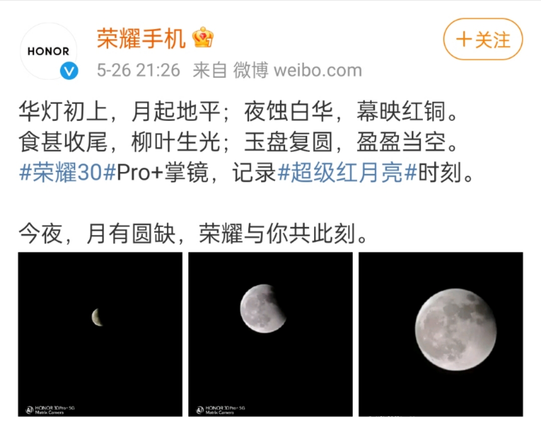 在全食和超級月亮刷屏的那天晚上,榮耀手機官方微博還在用一年多前推出的榮耀30Pro+展示其拍照實力。而這款機型還搭載着華為麒麟990芯片。