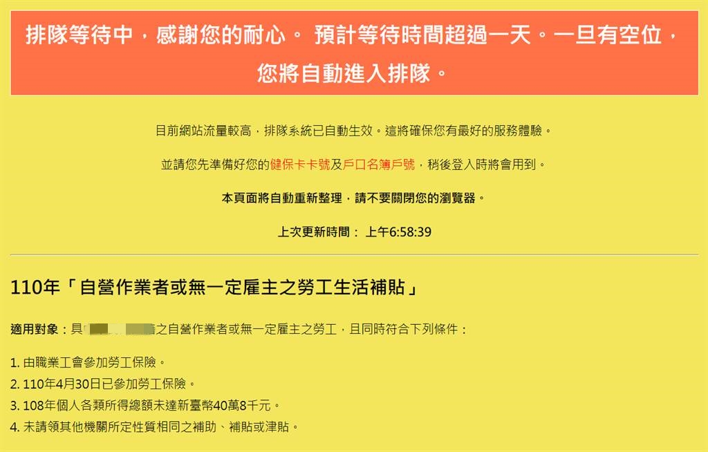 據台媒聯合新聞網6日報道,當日在台灣著名論壇PTT上,有網民貼心發文,提醒只要登錄“勞保局”網站輸入個人資料,就能確認自己是否具備領紓困金的資格。因此,有許多台網民在得知消息後,便紛紛搶在6日登錄,結果卻發現網站出現“大塞車”狀況,有網民甚至等了一個下午才進入網站,還有人要排隊700多分鐘(約12小時)才能進入。