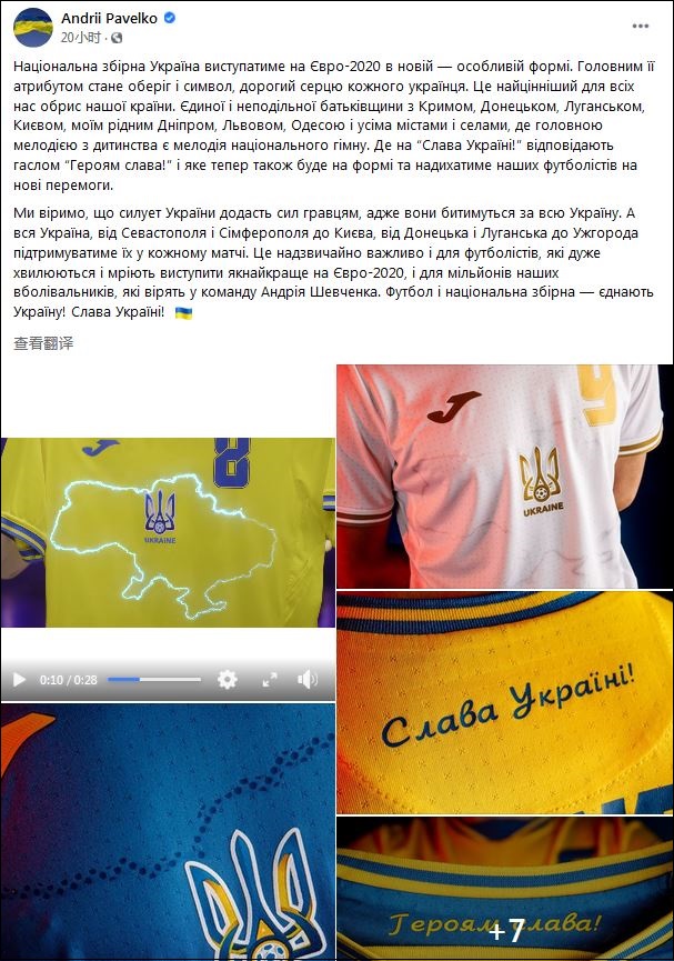 當地時間6月6日,烏克蘭足協主席帕維科(Andriy Pavelko)在臉書上揭曉了國家隊出征歐洲盃的球衣。與過往類似,球衣沿用了烏克蘭國旗的黃藍色,但新球衣在胸口有一幅烏克蘭地圖,其中包含了克里米亞。