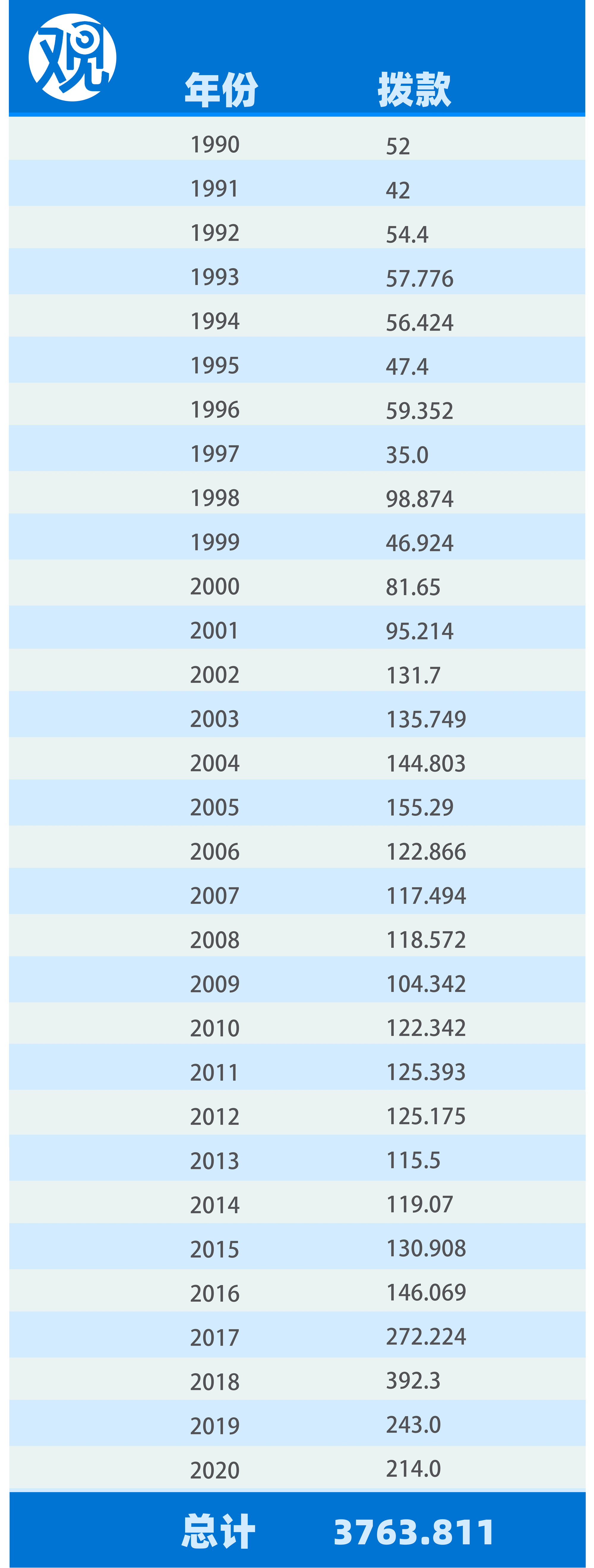 1951-2020年美國對以色列的援助(百萬美元,當年幣值,無通脹調整,下同)