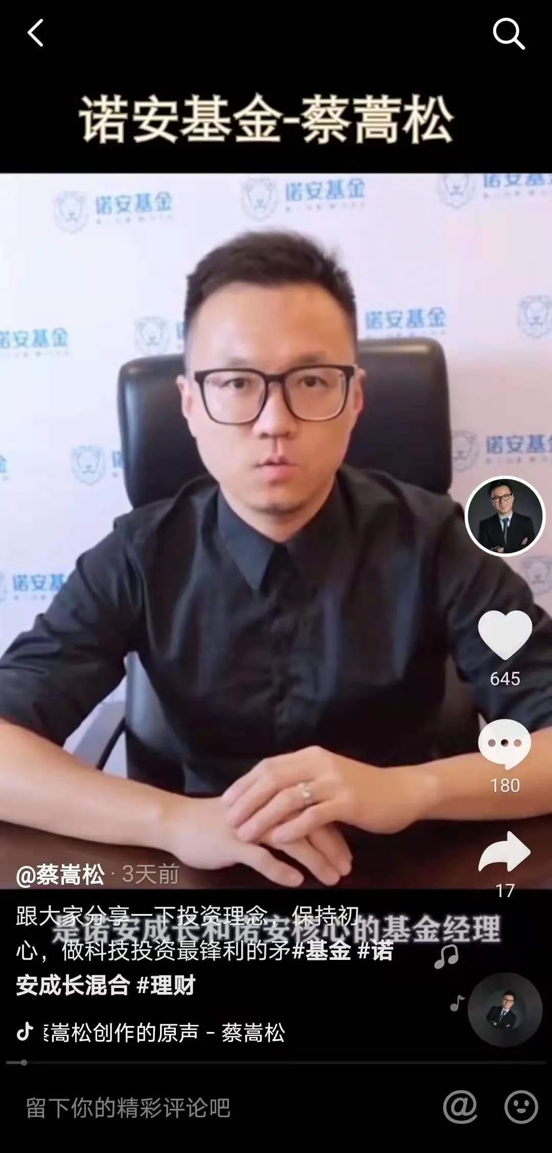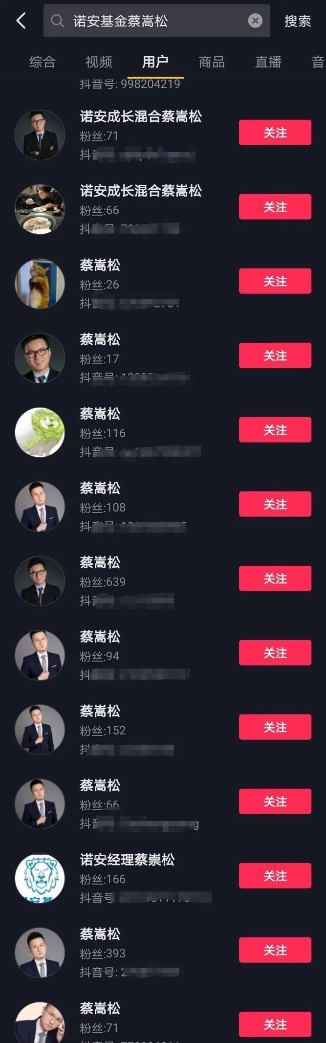 除了論壇社區,記者注意到,抖音搜索“蔡嵩松”,相關的抖音號多達數十個,甚至近期有的賬號的相關介紹,發佈的內容非常像是其本人發佈的信息,足以以假亂真。對此,諾安基金相關人士表示:“類似這樣的抖音號已經舉報過好幾個,這是舉報一個冒一個。”