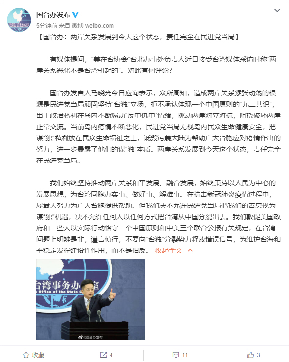 美方妄稱“兩岸關係惡化不是台灣引起的”,國台辦駁斥