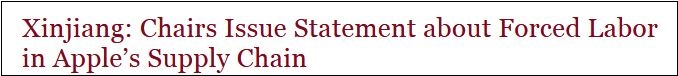 儘管沒有給出所謂的“證據”,但聲明還是要求蘋果首席執行官庫克剔除與新疆“強迫勞動”有染的中國供應商,並要求蘋果公司與美國海關暨邊境保護局就中國的供應商進行諮商,以確保蘋果的產品不是通過“強迫勞動”製造的。