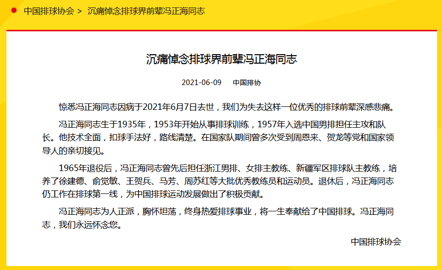 驚悉馮正海同志因病於2021年6月7日去世,我們為失去這樣一位優秀的排球前輩深感悲痛。