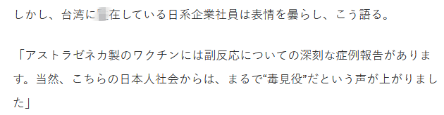 這篇報道中同時也提到了一些台灣民眾看到日本送AZ疫苗時的質疑態度,譬如“我聽説AZ疫苗是不安全的。日本竟然送給台灣?”“AZ疫苗的報道都是各類副作用,(送我們這個)真的是‘台日友好’嗎?”