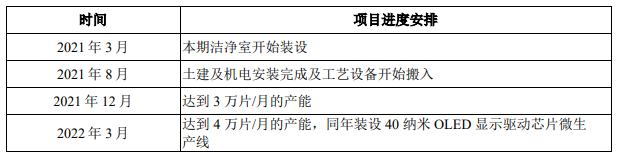 招股書顯示,12英寸晶圓製造二廠的項目進度為:2021年3月,潔淨室開始裝設;8月,土建及機電安裝完成及工藝設備開始搬入;12月,達到3萬片/月的產能。
