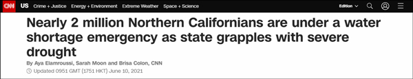 據美國有線電視新聞網(CNN)報道,6月9日,加州的舊金山灣區近200萬人處於缺水的緊急狀態。