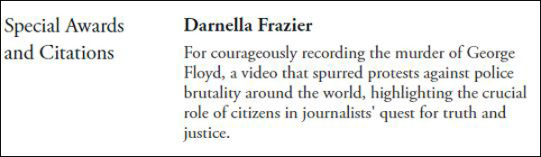 “因勇敢地記錄裏喬治·弗洛伊德(George Floyd)被謀殺的過程受到表彰,其作品激起了世界各地對警察暴行的抗議,突出了公民在記者尋求真相和正義方面發揮的關鍵作用。”
