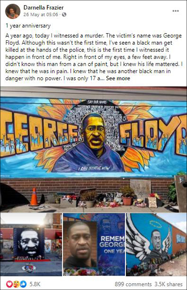 2021年5月底,正值弗洛伊德被殺一週年紀念日,弗雷澤在臉書上發表聲明稱,“儘管這對我來説是一次改變生活的創傷性經歷,但我為自己感到驕傲。如果不是因為我的視頻,世界就不會知道真相。我的視頻沒有拯救喬治-弗洛伊德,但它將謀殺他的兇手繩之以法,並使這種惡行離開街頭。”