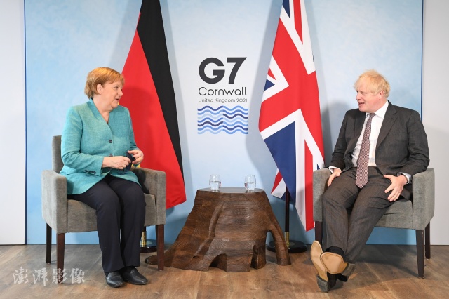 當地時間6月12日,G7峯會第二日,英國首相鮑里斯-約翰遜與德國總理默克爾舉行會晤。圖自澎湃影像