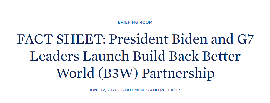 拜登鼓吹的計劃全稱為“重返更好世界:滿足中低收入國家巨大基礎設施需求的積極倡議”(Build Back Better World,簡稱B3W)。值得一提的是,這一名稱和拜登去年大選時的競選口號極為相似(Build Back Better,重建更美好的未來)。