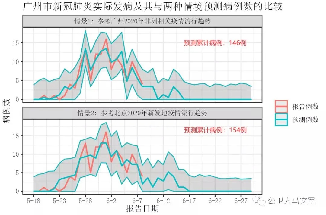 既然本次疫情與去年3月的疫情流行曲線相似,如果按照去年3月廣州疫情的流行趨勢來預測了本次疫情未來的變化(圖3),疫情約於6月17日清零,共146例左右。如果按照北京2020年新發地暴發疫情流行模式,預測疫情大約在6月18日清零,總病例154例左右。