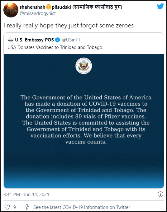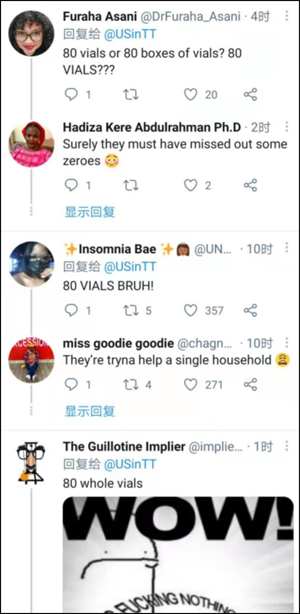 其實在美國駐特多大使館在推特上宣佈捐贈時,就收到了眾多網民的嘲諷。美媒“商業內幕”14日報道稱,“美國宣佈給140萬人口的國家捐贈80瓶疫苗,在網上遭到羣嘲。”