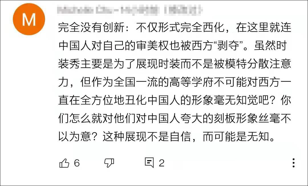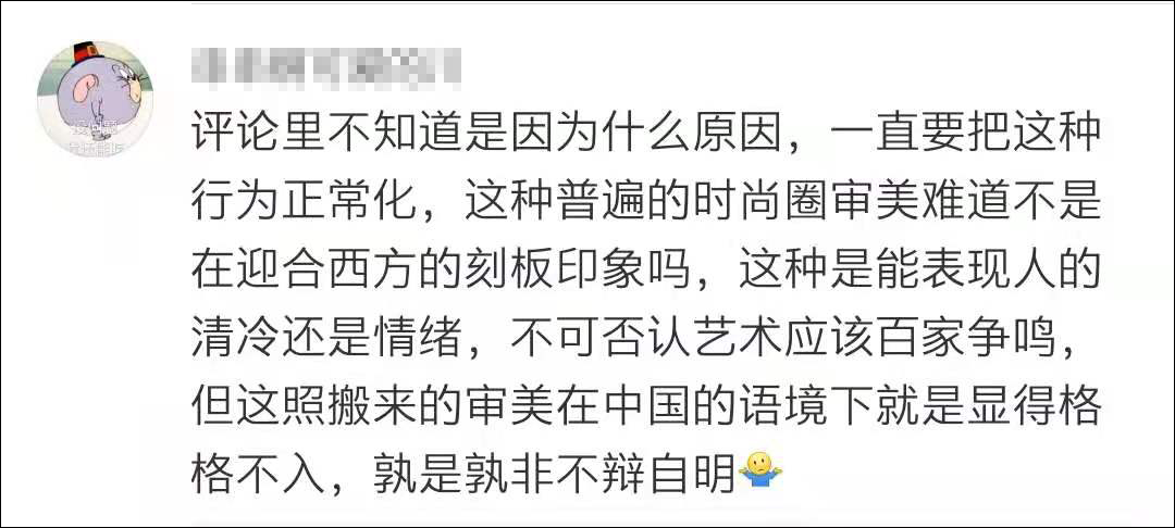 “評論裏不知道是什麼原因,一直要把這種行為正常化,這種普遍的時尚圈審美難道不是在迎合西方的刻板印象嗎?”