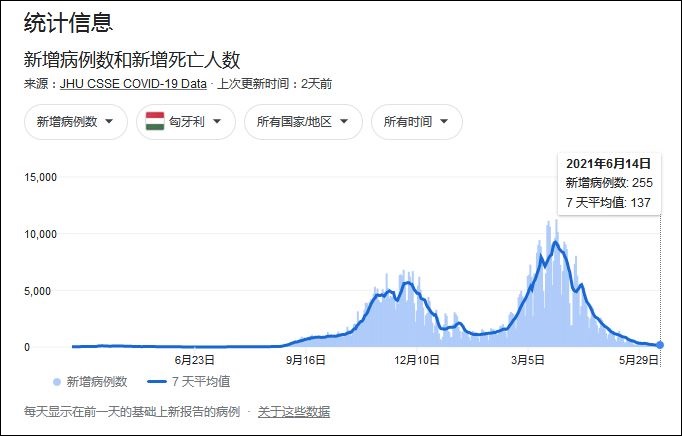 得益於疫苗的廣泛接種,匈牙利新冠疫情曲線也在進入4月後急速壓平。根據約翰斯·霍普金斯大學數據,匈牙利6月14日的新增病例數為255例,過去7天的平均值為每日137例。