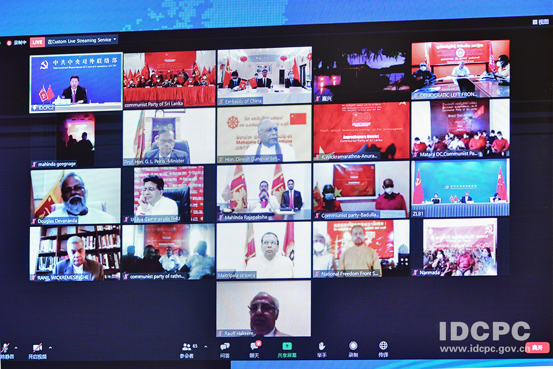 6月15日,中共中央對外聯絡部部長宋濤應邀以視頻方式參加斯里蘭卡朝野各政黨共同舉辦的中共百年華誕慶祝大會。斯人民陣線黨領袖、政府總理馬欣達,自由黨主席、前總統西里塞納,統一國民黨領袖、前總理維克拉馬辛哈,斯共產黨總書記維拉辛哈,人民聯合陣線領袖、外長古納瓦德納等斯12個朝野政黨主要領導人以及多位政府內閣部長、議員等參會。馬欣達轉達了戈塔巴雅總統對習近平總書記的誠摯問候,維拉辛哈宣讀斯朝野各黨聯署的慶祝中國共產黨建黨百年賀函。