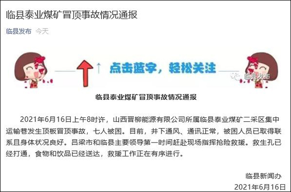 據“臨縣發佈”微信公號消息,2021年6月16日上午8時許,山西晉柳能源有限公司所屬臨縣泰業煤礦二採區集中運輸巷發生頂板冒頂事故,七人被困。目前,井下通風、通訊正常,被困人員已取得聯繫且身體狀況良好。呂梁市和臨縣主要領導第一時間趕赴現場指揮搶險救援。救生孔已經打通,食物和飲品已經送達,救援工作正在有序進行。
