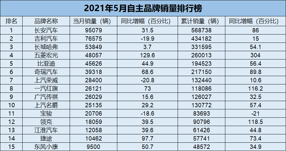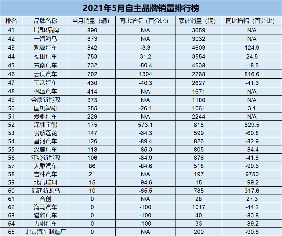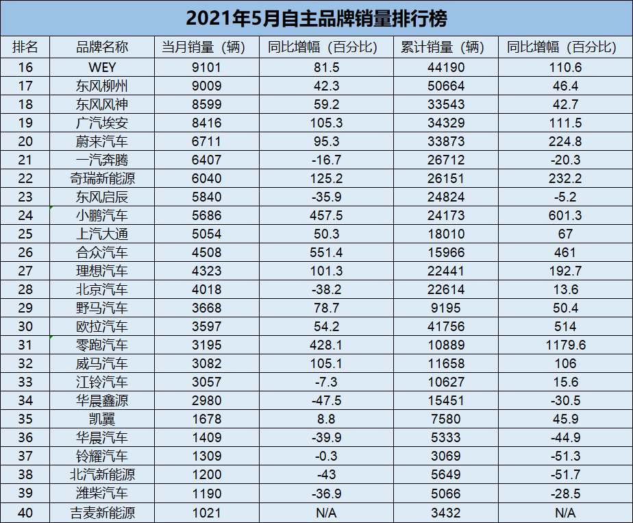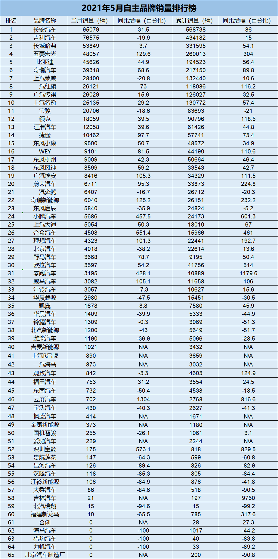 從品牌方面來看,自主品牌高於5月中國市場平均水平(下滑2.1%)為31個品牌,其中30個品牌保持正增長;低於平均水平的品牌為25個,另有9個月品牌無同期數據。不過,銷量過萬的品牌只有14個,比今年4月減少2個。