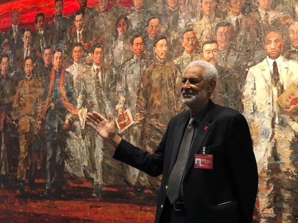 巴哈馬駐華大使在油畫《星火》前拍照