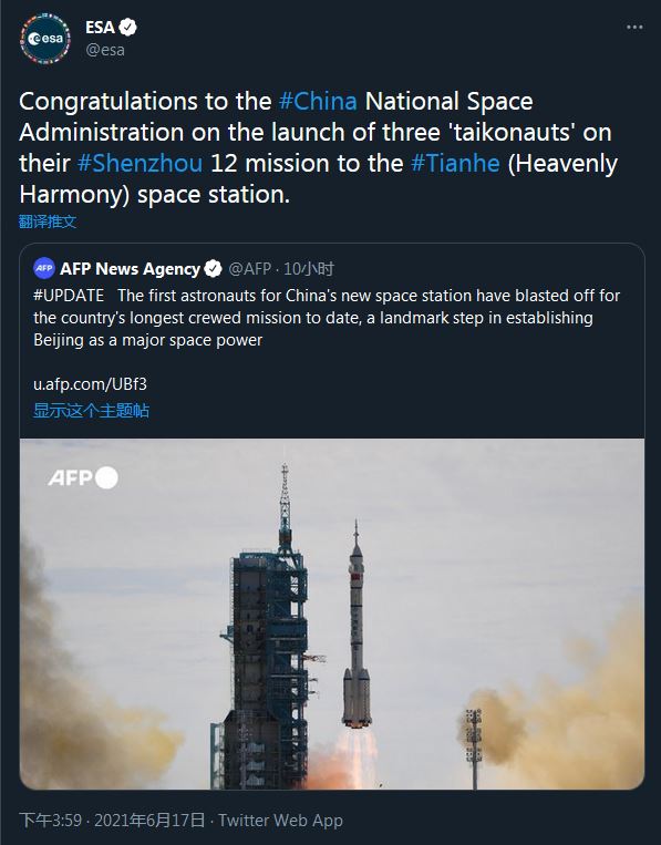 歐空局在推特上轉發了法新社的報道並寫道:“祝賀中國國家航天局發射神舟十二號載人飛船,將三名‘taikonauts’送入天和空間站(核心艙)。”