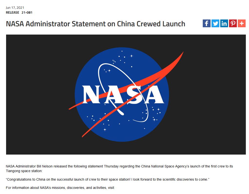 (觀察者網 訊)當地時間6月17日上午,美國國家航空航天局(NASA)在官網上發表聲明,以局長比爾·尼爾森(Bill Nelson)的名義,祝賀中國成功將航天員送入空間站。