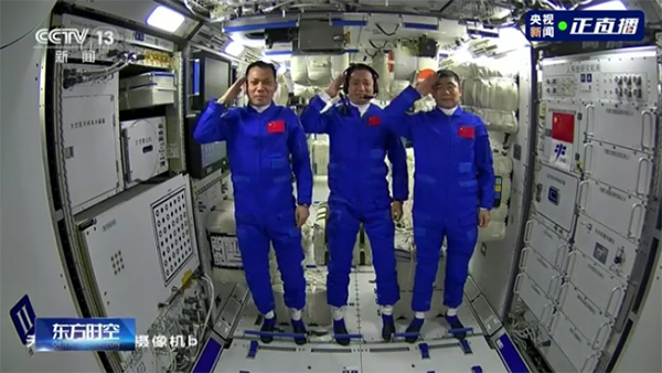 3位航天員在核心艙內向全國人民敬禮,央視新聞直播視頻截圖