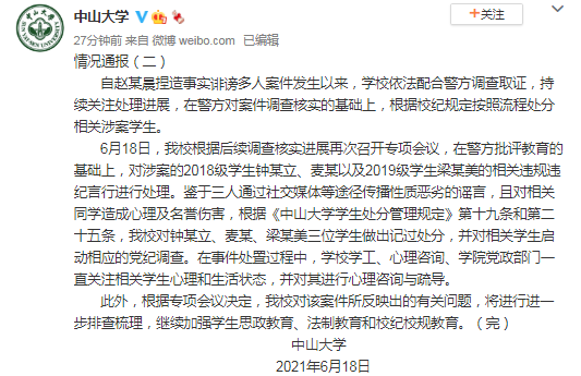 6月18日,我校根據後續調查核實進展再次召開專項會議,在警方批評教育的基礎上,**對涉案的2018級學生鍾某立、麥某以及2019級學生梁某美的相關違規違紀言行進行處理。**鑑於三人通過社交媒體等途徑傳播性質惡劣的謠言,且對相關同學造成心理及名譽傷害,根據《中山大學學生處分管理規定》第十九條和第二十五條,**我校對鍾某立、麥某、梁某美三位學生做出記過處分,並對相關學生啓動相應的黨紀調查。**在事件處置過程中,學校學工、心理諮詢、學院黨政部門一直關注相關學生心理和生活狀態,並對其進行心理諮詢與疏導。