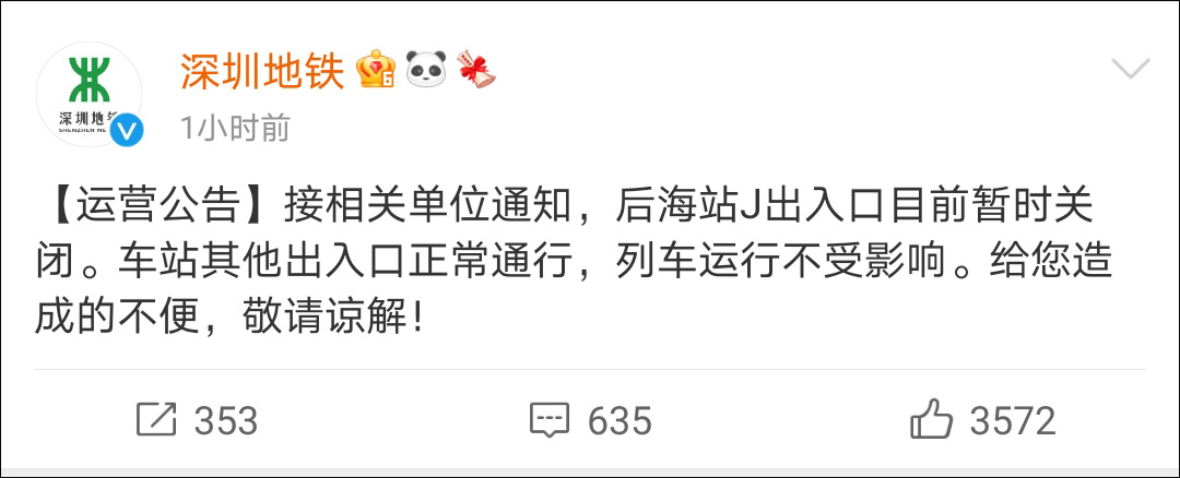 另據微博@深圳地鐵18日16點38分發布的最新公告:接相關單位通知,後海站J出入口目前暫時關閉。車站其他出入口正常通行,列車運行不受影響。給您造成的不便,敬請諒解!