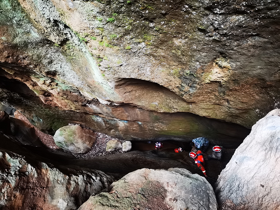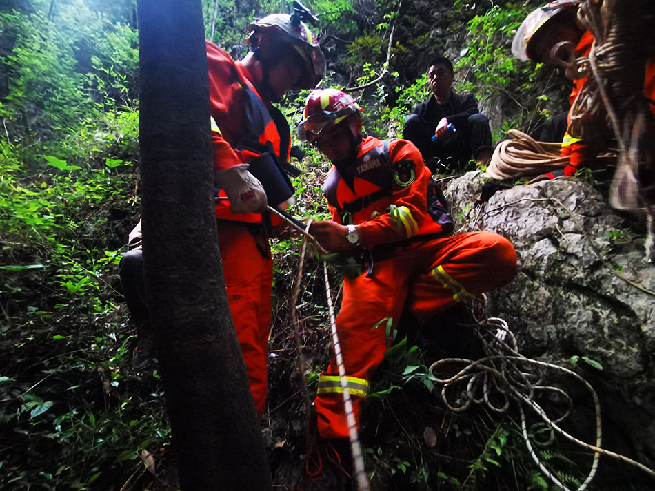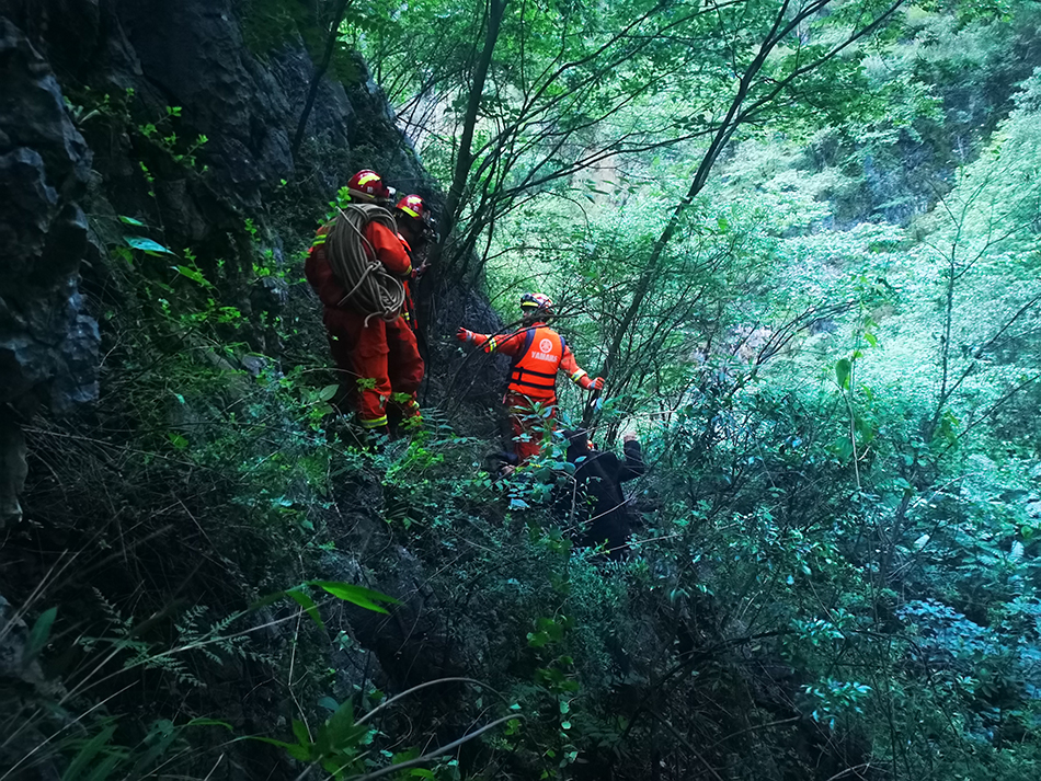 在搜索過程中,搜救隊員翻山越嶺,相互搭建“人肉”梯子,徒步行進了接近三小時後,到達人員被困區域附近,經過現場偵查發現,救援人員要到達谷底,必須利用繩索下降三級台階;每級台階的高度約在10米左右,其中一處地縫一次只能允許一名人員通過,每級台階都需建立支點和預留輔助人員。多方人員經商討後立即制定救援方案,由5名消防救援人員帶領1名經驗豐富的民兵通過繩索逐級下降至谷底開展救援,在做好防護措施後,搜救隊開始逐級下降,第一個台階下降6人,第二個台階下降4人,第三個台階下降2人,在安全繩的牽引下,各級台階救援人員順利達到指定位置。