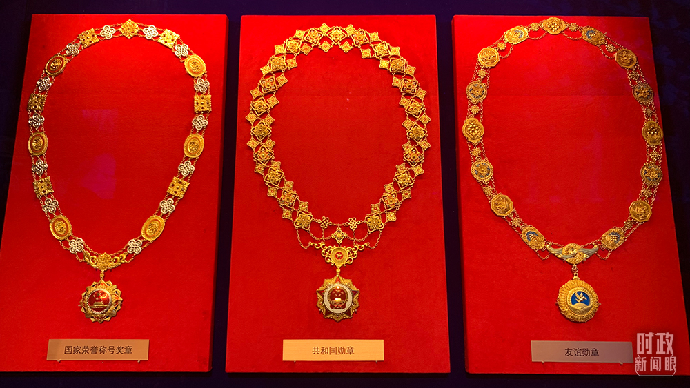 △從左至右分別是國家榮譽稱號獎章、共和國勳章、友誼勳章(總枱央視記者石丞拍攝)