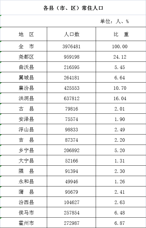臨汾市第七次全國人口普查登記各縣(市、區)人口分佈情況。臨汾市統計局官網 圖