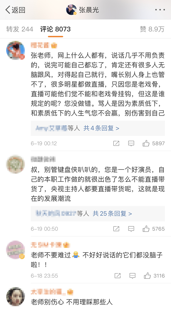 很多網友留言安慰張晨光,稱無論是演戲還是直播帶貨,都是憑自己工作在賺錢,勸他不要太過在意網友不友善的評論,做好自己的工作就行了。