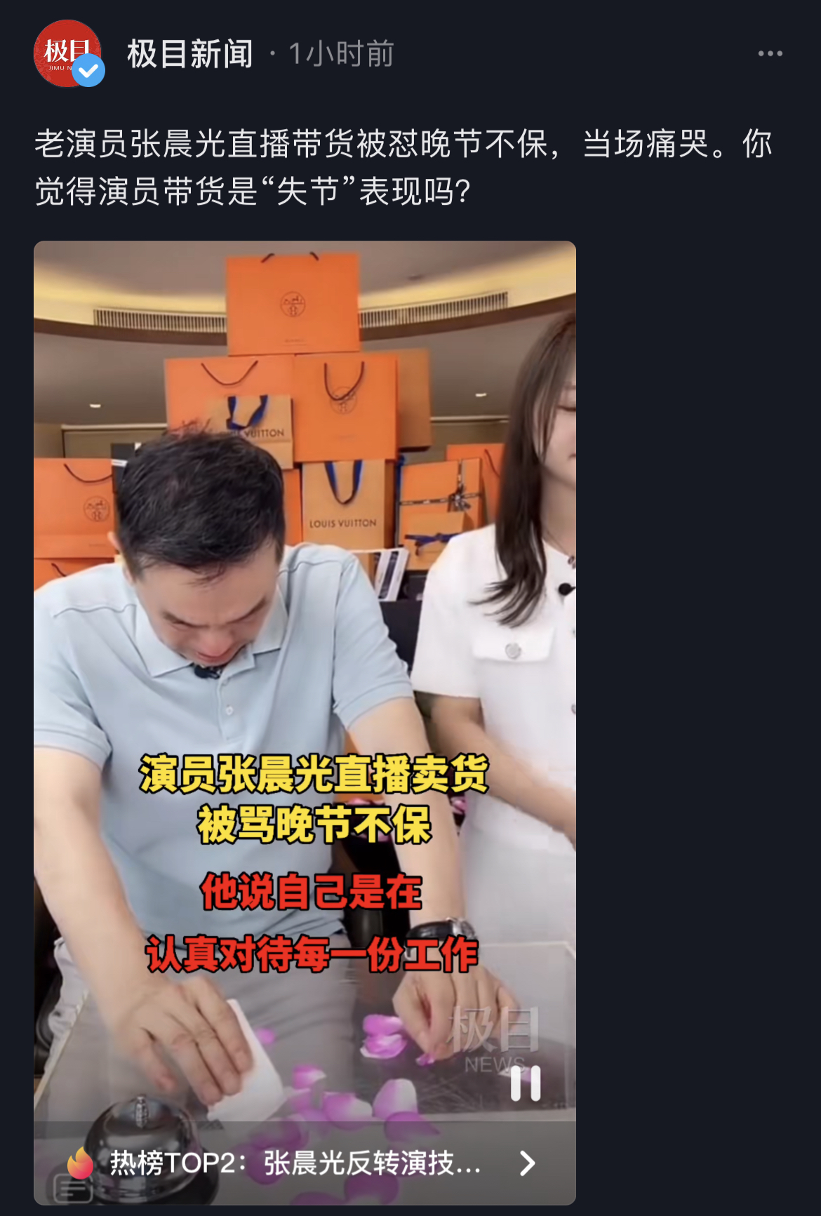 他一邊擦眼淚一邊跟網友鞠躬道歉,稱聽到自己被説“晚節不保”時很傷心,“一路走過來三十幾年,我在我的演藝事業上兢兢業業,我把每個角色都給扮演好。到這個直播間裏,也是想把自己的另一個才能表現出來……”話説到一半他就哽咽到説不出話來了。