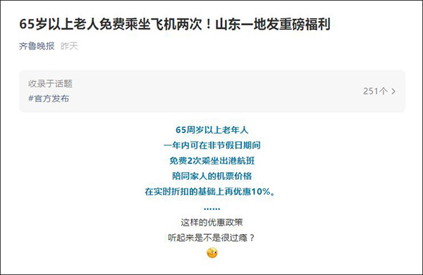 “齊魯晚報”微信公號6月19日消息,65週歲以上老年人一年內可在非節假日期間免費2次乘坐出港航班,陪同家人的機票價格在實時折扣的基礎上再優惠10%。這樣的優惠政策,聽起來是不是很過癮?
