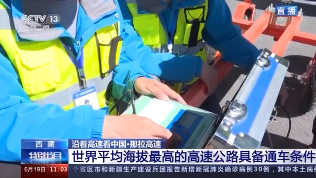 總枱記者 王磊:我現在就是在世界平均海拔最高的高速公路那拉高速羊八井至那曲段的起點上。這裏的海拔是4380米,現在我們可以看到有不少工程車正在對最後一段路面進行技術檢測。我旁邊正在調試的設備叫作八輪儀,主要是用來檢測路面的平整度,一旦路面的高差大於1.2毫米,儀器就會發出預警。而在我前方還有兩台橋樑檢測車,對橋樑的外觀和質量進行檢測。